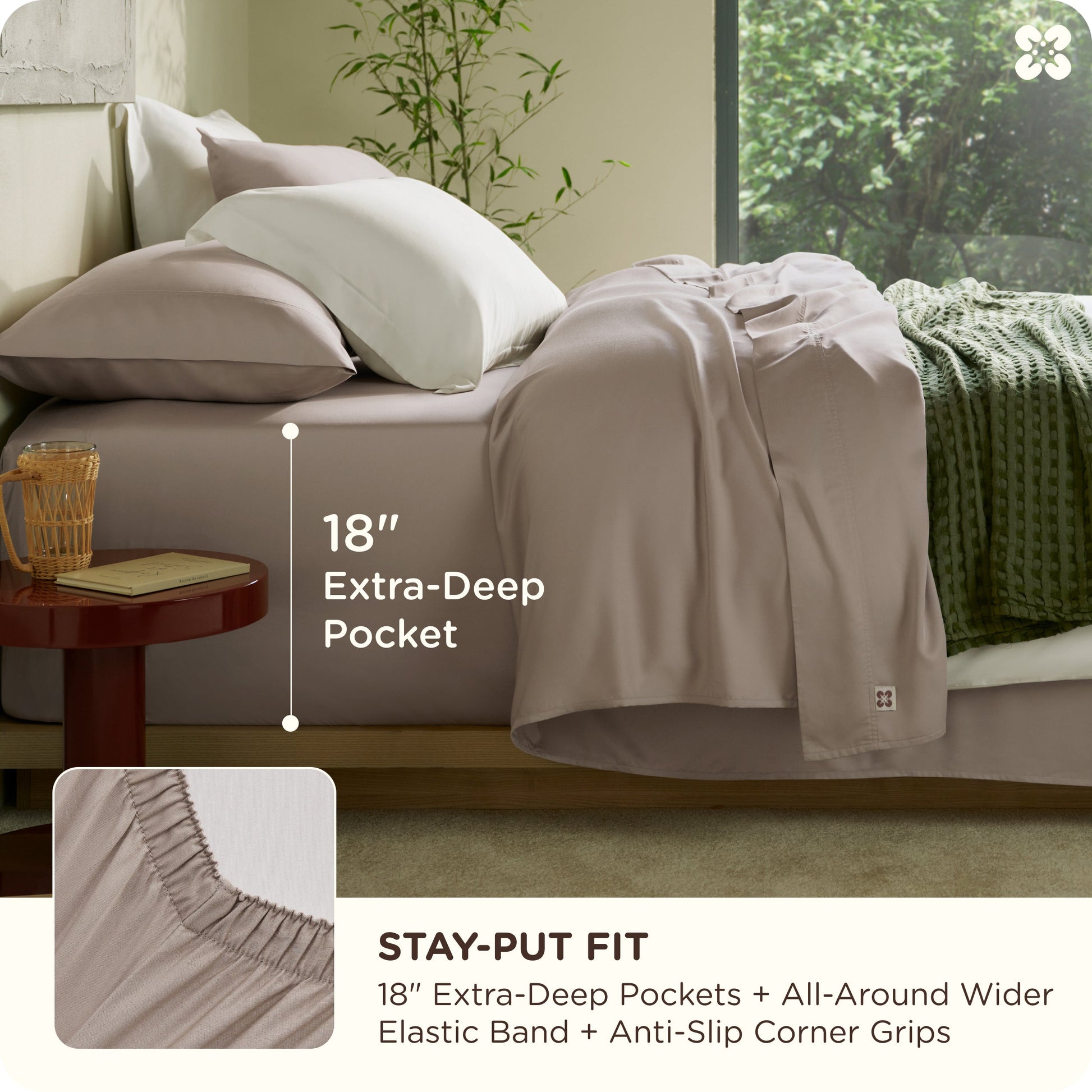 - Secure Fit & No-Slip Design: 18" deep pocket, 360° extra-wide elastic band, and reinforced corner grips ensure a snug fit for mattresses up to 18". Pillowcases feature secure envelope closures for a stay-put fit.