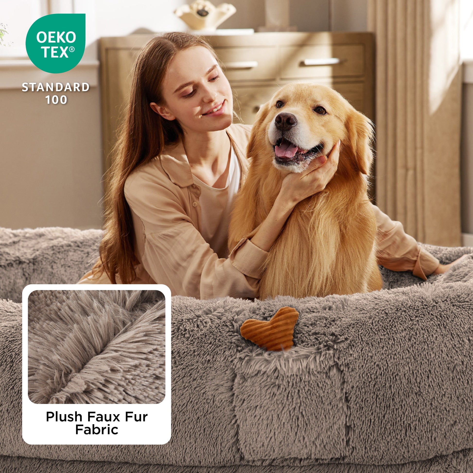 Material: Chopped recycled foam (bolster), high-density support foam (core), faux shag fur (cover), waterproof fabric (sleeping area cover)